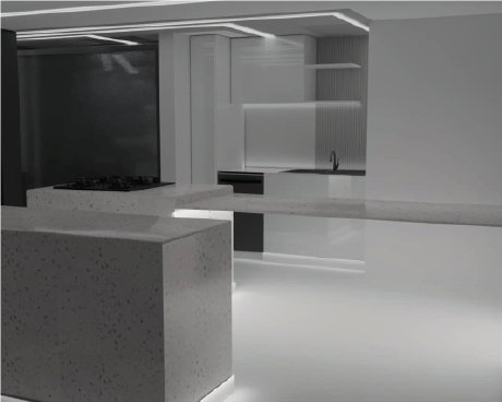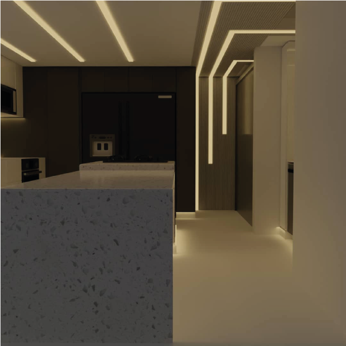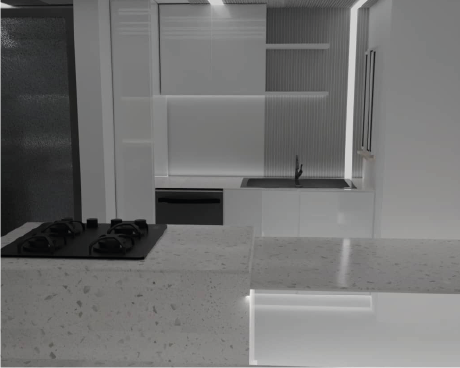 The execution of an American-style kitchen with quality finishes is characterized by its modern design and functionality, with an open distribution that integrates the kitchen with the dining room and the living room. The kitchen style offers a feeling of spaciousness and comfort.